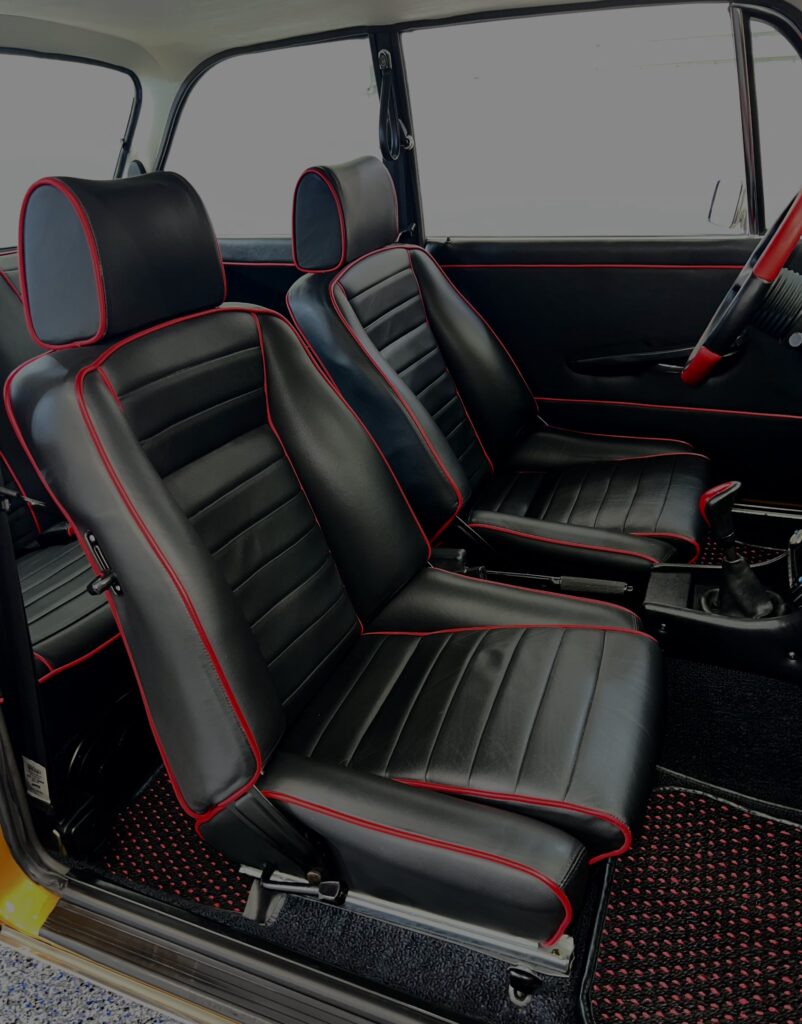 · I installed front seats from a 1974 Turbo and had the front and rear seats re-upholstered in black leather with red piping.