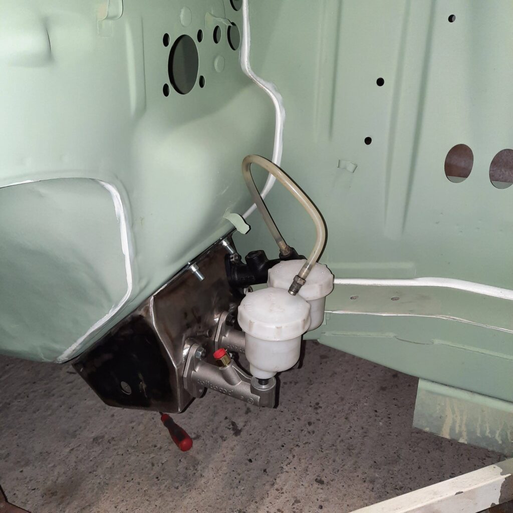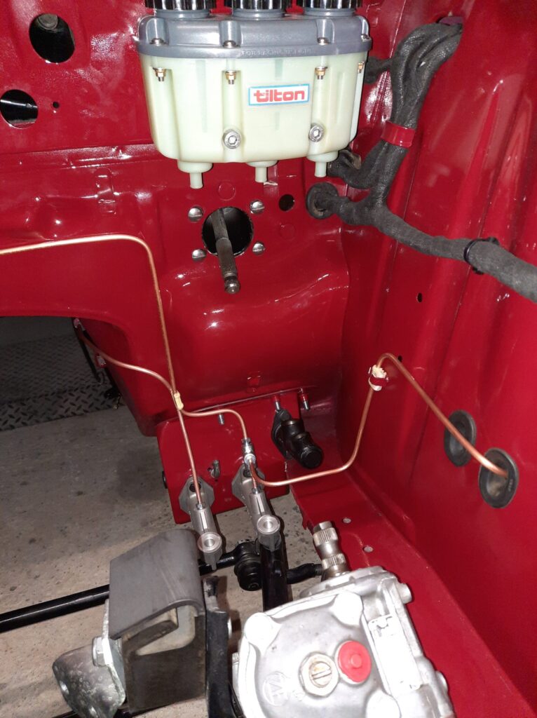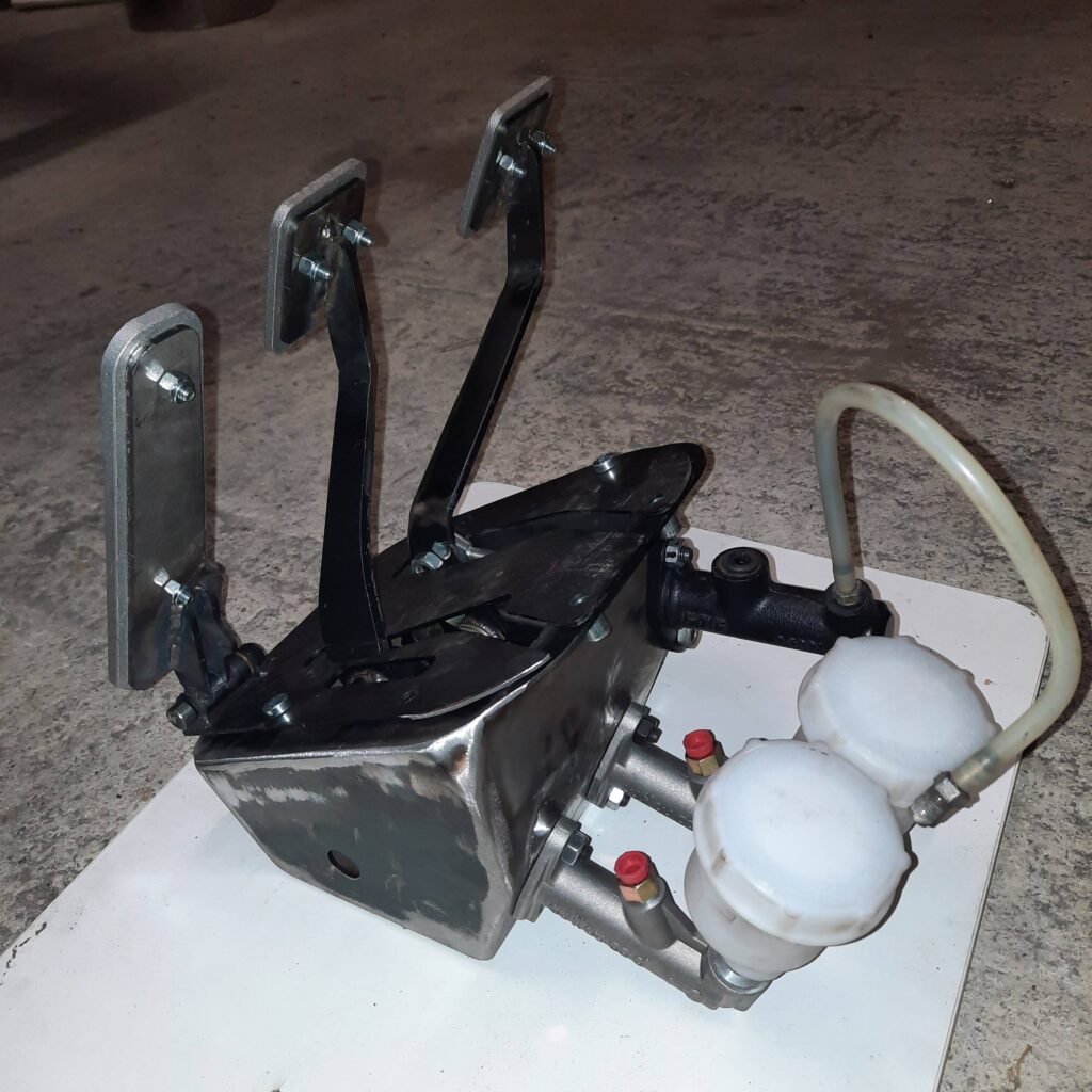 Specific homemade pedal box with removal of the mastervac: assembly two brake master cylinders with a mechanical bias: the space saving made it possible to mount a Jenvey injection ramp with long cones and an integral air filter