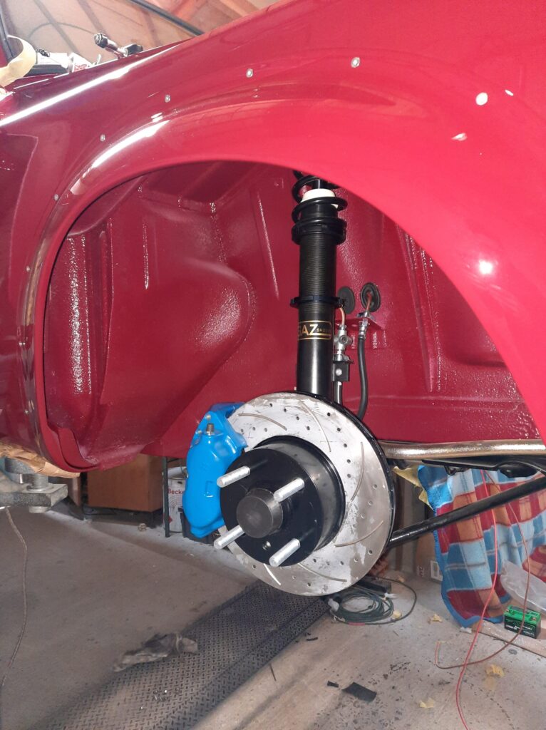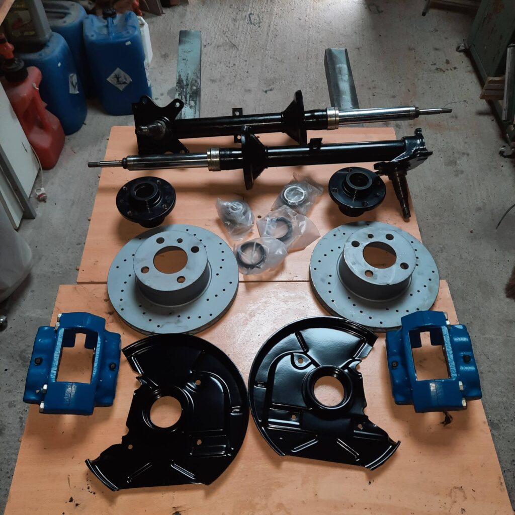 Front: ventilated grooved disc from E30 320i; modified 635Csi brake calipers: